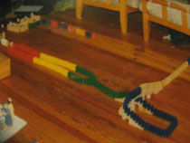 Ab 2002 begann meine Mutter mit zwei weiteren Familien einen eigenen "Domino Day" zu organisieren, für den wir eine leerstehende Kirche in einem Dorf bei Saarbrücken und später die Turnhalle meiner Schule für jeweils einen Tag nutzen konnten. Das waren für mich absolute Feiertage. Das größte dieser Events kam auf etwa 19 000 Dominos. (Die beiden Fotos hier zeigen Abschnitte, die nicht von mir gebaut wurden.)